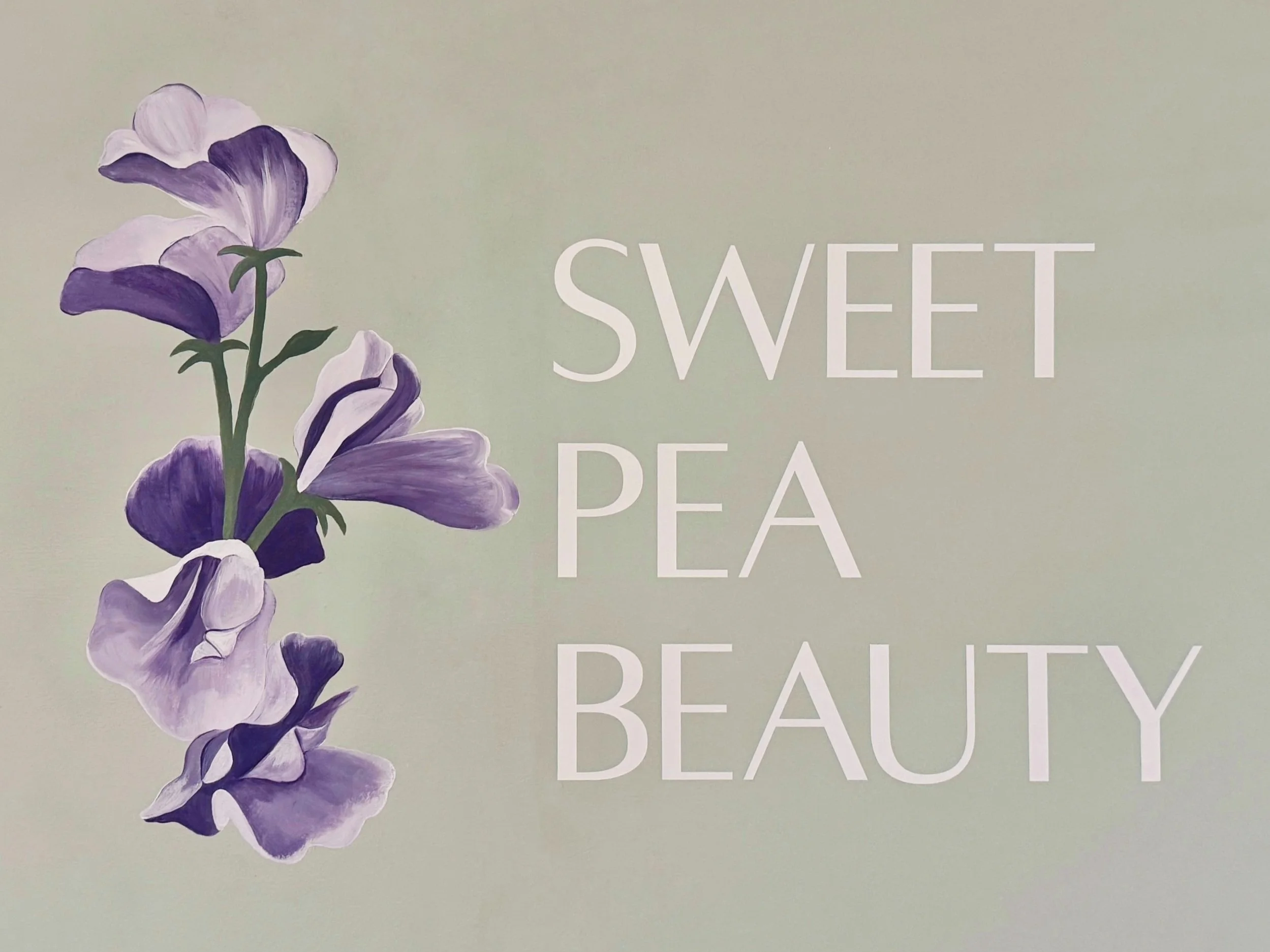 Commissioned wall art for beauty studio Sweet Pea Beauty, featuring a hand-painted illustration of sweet pea flowers and custom-designed vinyl lettering
