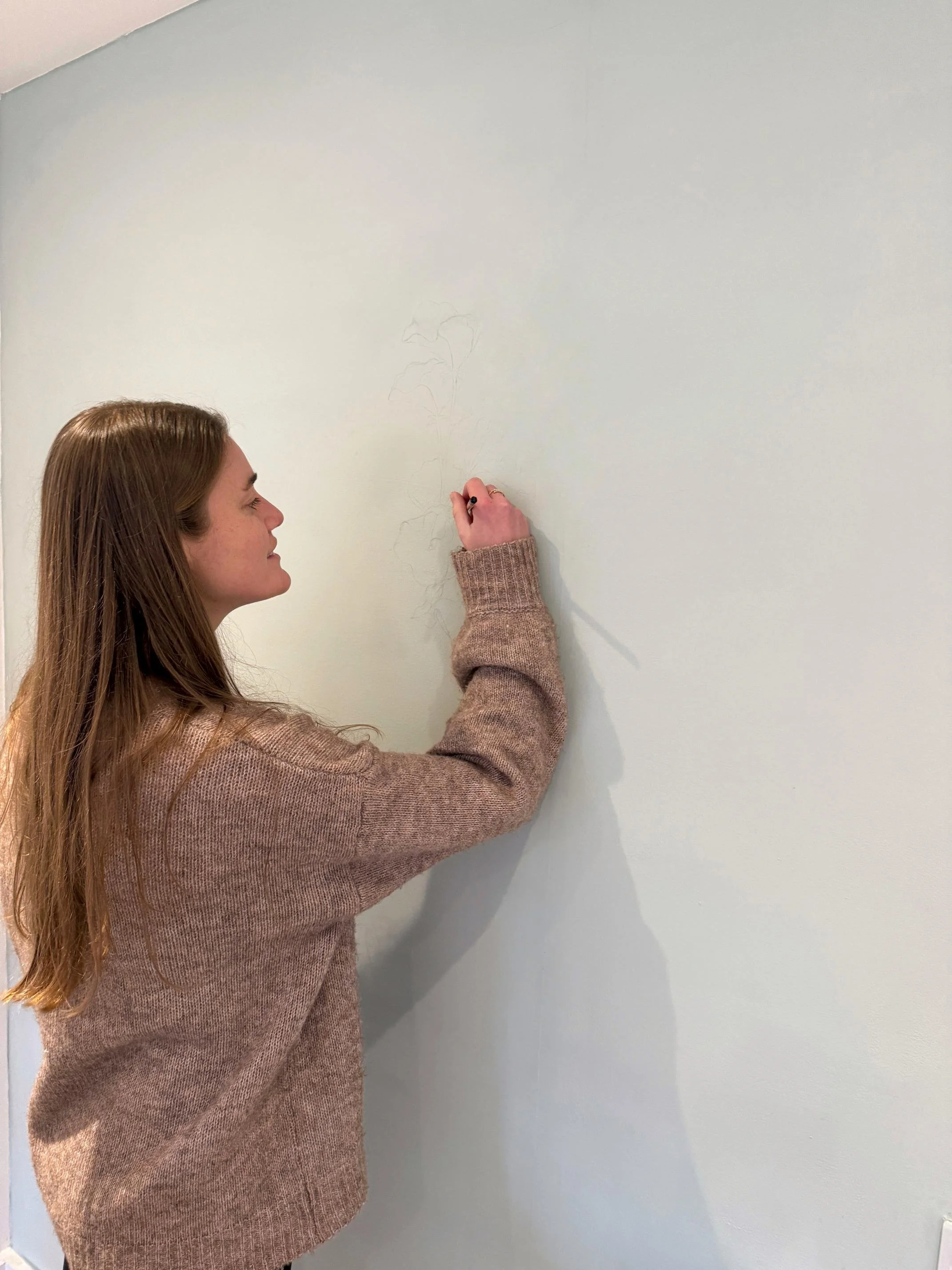 To start, I carefully measured the wall and marked the centre, ensuring the painting and vinyl lettering would be perfectly positioned. I sketched out the floral design in pencil, then began painting. While I brought a whole set of brushes, I ended up using just one, which allowed me to blend the shades more naturally and maintain a consistent style throughout.